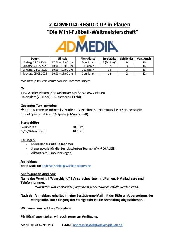 Im WM-Jahr wird der ADMEDIA-REGIO-Cup als Weltmeisterschaft ausgespielt. Jedes Team tritt für ein Land an. Ihr wollte dabei sein? Dann meldet euch schnell an. Wir freuen uns drauf.