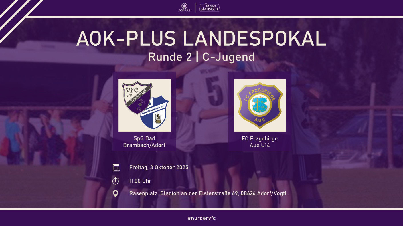 Am Feiertag erwartet euch in Adorf ein echtes Pokal-Highlight. Unsere C-Junioren der Spielgemeinschaft Bad Brambach/Adorf treffen in der zweiten Runde des AOK Plus-Landespokals auf die U14-Auswahl des FC Erzgebirge Aue. Mit dem Titel des Meisters und Vizepokalsiegers der letzten Saison im Rücken wollen unsere Jungs alles geben. Ob es gelingt, den Favoriten zu ärgern? Im Pokal ist bekanntlich alles drin. Anstoß ist um 11:00 Uhr auf dem Adorfer Rasenplatz. Das Schiedsrichtergespann besteht aus Steffen Windisch, Felix Meinel und Finn Weber. Kommt vorbei und unterstützt unser Team – wir freuen uns auf ein spannendes Spiel und viele Zuschauer.