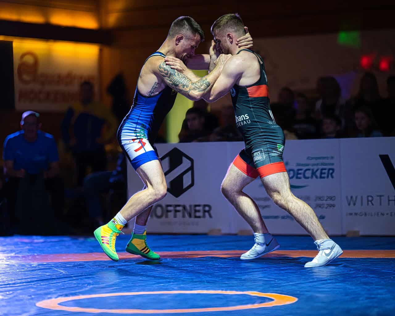 Dennis Aleksandryuk (75 kg/FR) wehrte sich gegen den Rumänen Maxim Fricatel tapfer und ließ nur eine 0:10-Niederlage zu. Die RKG Reilingen/Hockenheim kam den drei Mannschaftspunkten von Fricatel noch einmal bis auf 11:14 heran. Doch Aigazi Minatulaev (80 kg/GR) ließ die Hoffnungen der Gastgeber vor immerhin 250 Zuschauern schnell platzen, nach 1:40 Minuten drückte der WKG-Neuzugang, seinen Gegner Stiven Brandy Schäfer auf beide Schultern.