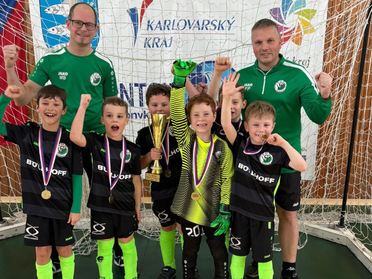 Am Samstag nahm die F1 von Merkur an einem Turnier im tschechischen Aš teil – Gastgeber war der TJ Jiskra Aš. Aufgrund zahlreicher Ausfälle, sowie eines weiteren Turniers am Sonntag war der Kader stark dezimiert. Dennoch reiste das Team mit fünf eigenen Spielern und unterstützt von Henry aus der G-Jugend, an. So stand immerhin ein Auswechselspieler zur Verfügung, um die 15-minütigen Spiele gut aufteilen zu können. Für die Kinder war es eine neue und besondere Erfahrung im Ausland – doch die gemeinsame Sprache hieß Fußball. Im ersten Spiel gegen Jiskra Aš B zeigte die Mannschaft von Beginn an großen Einsatz und gewann das Spiel knapp, aber verdient mit 1:0. Im zweiten Spiel gegen Jiskra Aš A folgte eine starke Leistung mit vielen schönen Spielzügen, gutem Spielaufbau und zahlreichen Balleroberungen. Der klare 5:0-Sieg spiegelte den Spielverlauf deutlich wider. Nach zwei Spielen Pause stand die Partie gegen den bis dahin am stärksten auftretenden FC Františkovy Lázně an. Auch hier ließ Merkur keine Zweifel aufkommen: Jeder Spieler brachte sich ein, das 1-gegen-1 wurde endlich mutig und dynamisch gesucht und am Ende stand ein souveräner 5:0-Erfolg. In allen drei Spielen überzeugte die Mannschaft durch sehr gute Abwehrarbeit. Selbst häufige Rotationen auf mehreren Positionen, sowie eine gleichmäßige Verteilung der Spielzeit auf alle Kinder taten dem Spielfluss wenig Abbruch. Nach insgesamt drei Spielen – einer rund 45-minütigen Pause – folgte das letzte Spiel des Tages gegen SK Hranice, deren Team aus sehr jungen Spielern bestand, die erst seit etwa zwei Monaten im Training waren. Es entwickelte sich ein komplett einseitiges Spiel. Man passte sich diesem etwas an, denn mit besserem Pressing hätten die Tore vermutlich noch früher fallen können, dennoch erzielte Merkur ab der 4. Spielminute insgesamt acht Treffer. Besonders erfreulich: Jeder Spieler konnte sich in die Torschützenliste eintragen. Kurz vor Schluss fiel noch der Ehrentreffer des Gegners zum 8:1-Endstand. Yannis stand aufgrund der Spielüberlegenheit weit vor dem eigenen Tor, ein Ball rutschte durch und wurde per Weitschuss von der Mittellinie verwertet. Das brachte nochmal richtig Stimmung in die gut gefüllte Halle. Insgesamt präsentierte sich Merkur als starke, spielfreudige Mannschaft, die sich auch unter widrigen Bedingungen nicht aufgab und die erfolgreiche Hallensaison mit einem weiteren Turniersieg fortsetzte. (MB)