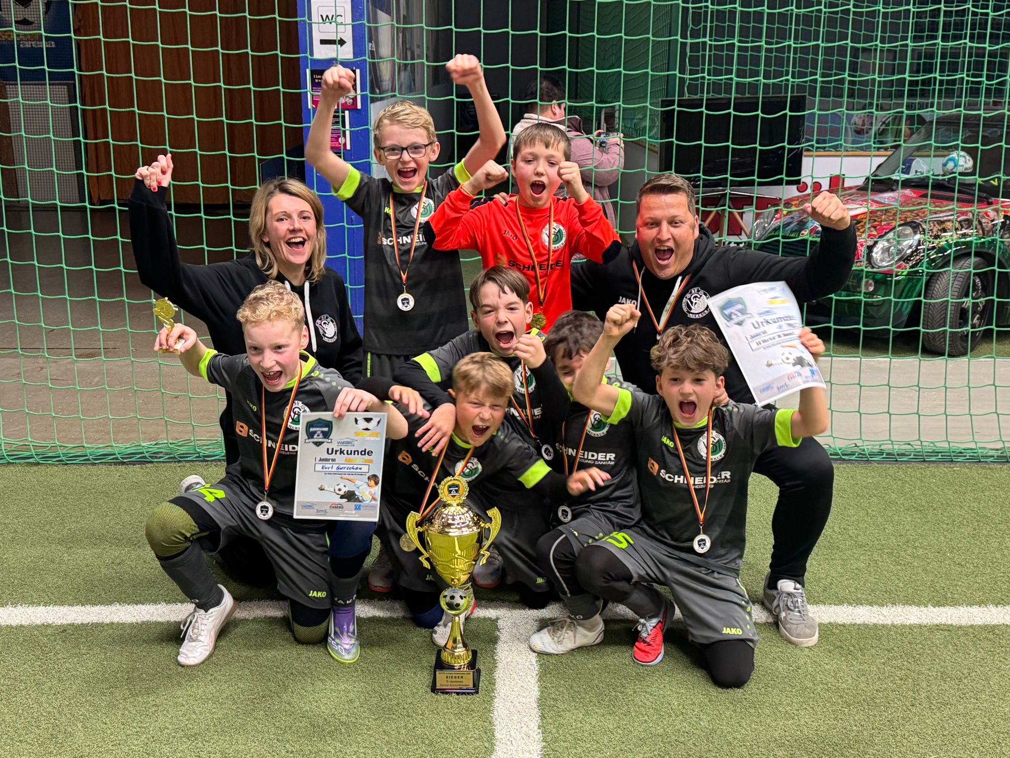 Auf weite Reise ging unsere U11 am vergangenen Wochenende. Gespielt wurde am Samstag ab 09.00 Uhr in der Soccer-Arena Dresden beim Wintec-Autoglas-Budenzauber, vielen besser bekannt als der ehemalige „Dubai-Cup“. Insgesamt waren, bei der größten Hallenfußball-Turnierserie Deutschlands, 32 Teams beim Turnier der U11-Junioren am Start. Um nicht schon sehr früh aufstehen zu müssen, startete unser gesamter Merkur-Tross, bestehend aus den Merkur-Kickern sowie Eltern, bereits am Freitagmittag und übernachtete in einer Pension vor Ort. Nach der Ankunft genossen wir ein leckeres Abendessen und ließen den Tag gemütlich ausklingen. Der nächste Morgen startete mit einem ausgiebigen Frühstück. In der großen Halle sollten uns wenig später insgesamt 7 Vorrundenspiele auf Kunstrasenplätzen (mit und ohne Bande) bevorstehen. Bei unserer vierten Teilnahme in Dresden, wollten wir es endlich mal bis ins Viertelfinale schaffen und somit eine einstellige Endplatzierung erreichen. Nachdem wir mit einem deutlichen 6:0 Auftaktsieg (Levi 3x, Eddy 2x, Kurt) gegen Limbach-Oberfrohna ins Turnier starteten, legten wir auch in den Spielen 2 und 3 entsprechend nach und schlugen Zlicin 2 nach Rückstand mit 4:2 (Tore John 2x, Levi, Eddy) sowie Dresden Leuben mit 3:1 (John, Kurt, Eddy). Im letzten Spiel im „Käfig“ mit Vollbande forderte uns nun die SpG Döbern/ Tschernitz in Spiel 4. Nach komfortabler 3:0-Führung (Levi 2, Kurt) luden wir den Gegner zu zwei Treffern ein und machten es selbst noch einmal spannend. Am Ende brachten wir die Führung aber über die Zeit. Trotzdem machten wir den Merkur-Jungs klar, dass das Turnier keine Nachlässigkeiten erlaubt und schärften nochmals die Sinne. Nun wechselten wir auf die Kunstrasenplätze ohne Bande und wollten auch hier an die bisherigen Leistungen und Ergebnisse anknüpfen. Nach einem souveränen 3:0 Sieg gegen den Berbisdorfer SV (Levi 2, Eddy) standen wir schon vor den beiden abschließenden Gruppenspielen erstmals als Teilnehmer für das Viertelfinale fest. Um aber dem FC Energie Cottbus aus dem Weg zu gehen, musste der Gruppensieg her. So stand im Spiel gegen den Nietlebener SV das „Endspiel“ um den Gruppensieg an. Nach dem wir zu inkonsequent ins Spiel starteten und auch verdientermaßen in Rückstand gerieten, ging ein Ruck durchs Team und wir schnürten den Gegner immer mehr in dessen Hälfte ein. Hatten wir mit gleich zwei Alu-Treffern von Kurt erst noch Pech, konnte unser immer besser aufspielende John per Doppelpack das Spiel auf Merkur-Seite drehen und wir das Spiel auch verdient gewinnen. Im abschließenden Gruppenspiel gegen Hertha Zehlendorf musste nun mindestens 1 Punkt her um den Gruppensieg perfekt zu machen. Hier gewannen wir durch einen Treffer von Kapitän Levi zwar nur mit 1:0, ließen dem Gegner aber nicht den Hauch einer Chance und hätten deutlicher gewinnen müssen. Mit 7 Siegen aus 7 Spielen stand somit der verdiente Gruppensieg fest und wir hatten unsere Zielsetzung mit dem Erreichen des Viertelfinals somit schon erreicht. Die Merkur-Jungs hatten nun aber Hunger auf mehr und spielten immer besser auf. Unseren Viertelfinal-Gegner Dresden Süd-West spielten wir schwindelig. Dreierpacker John und Levi schossen den 4:0 Sieg heraus. Da zusätzlich der große Favorit Energie Cottbus im Viertelfinale scheiterte, war der Turnierausgang offener denn je. Im Halbfinale wartete mit dem FC Eilenburg ein weiteres Schwergewicht auf uns. Doch mit einer konzentrierten Leistung von Sekunde eins an, zogen wir auch den Eilenburgern den Zahn. Eddy konnte hier einen Doppelpack erzielen und Kurt steuerte den dritten Treffer bei. Auch eine kuriose Zeitstrafe gegen Noah (der Schiedsrichter verwechselte ihn hier wohl mit dem zuvor „verwarnten“ Eddy) konnte uns nicht stoppen und wir standen nach einer weiteren Glanzleistung und dem 3:0 Sieg tatsächlich im Finale gegen den Hoyerswerdaer SV. Nachdem die Merkur-Jungs in der Vergangenheit in entscheidenden Spielen gerne mal verkrampften, gaben wir Trainer dem Team nur die Botschaft mit, dass sie das Spiel genießen und Spaß haben sollten. In einem zunächst typischen Finalspiel mit viel Aufregung auf beiden Seiten, entwickelte sich ein ausgeglichenes Spiel. Hoyerswerda ging dann durch einen strammen Knaller aus dem Hinterhalt in Führung. Da Final-Spiele bekanntlich dafür da sind gewonnen zu werden, dachte sich unser Keeper Mats das Spiel wieder spannend zu machen und zimmerte den Ball aus großer Distanz in den rechten Winkel des Hoyerswerdaer Tores. Es stand somit 1:1 und alles war wieder offen. Wir hatten nun mehr Spielanteile und zwei Chancen zur Führung. Auf der Gegenseite aber auch Glück, dass ein Ball vom Innenpfosten nicht ins Tor sprang. Als sich Alle schon auf das bevorstehende Neunmeterschießen einstellten, hatte unser Kurt noch eine Idee und konnte nur per Foul gestoppt werden. Den anschließenden indirekten Freistoß legte er auf Kapitän Levi ab und dieser hämmerte den Ball nochmal aufs gegnerische Gehäuse. Leicht abgefälscht schlug der Ball 10 Sekunden vor Spielende rechts unten im Tor ein und grenzenloser Jubel brach aus. Wir mussten uns nun aber nochmal kurz zusammenreißen, da der Schiedsrichter das Spiel nochmal freigab. Hier ließen wir aber nichts mehr anbrennen und mit dem Schlusspfiff brachen alle Dämme bei uns Sperken. Die Sensation war perfekt und wir gewannen tatsächlich den „Dubai-Cup“. Aus einer geschlossenen Mannschaftsleistung, ragten mit Antreiber und Kapitän Levi, Abwehrchef Kurt und unserem Keeper Mats und dem Sturm-Duo John & Eddy nochmal einige Jungs heraus, die einen Glanztag erwischten. Da ein solcher Erfolg aber immer eine Teamleistung ist, haben aber auch Michl, Nick und Noah einen großen Anteil am Turniersieg. Levi durfte wenig später den riesigen Pokal für den Gewinner entgegennehmen und zusätzlich wurde Kurt noch ins All-Star-Team des Turnieres berufen und konnte sich über eine persönliche Auszeichnung freuen – seine Mannschaftsk