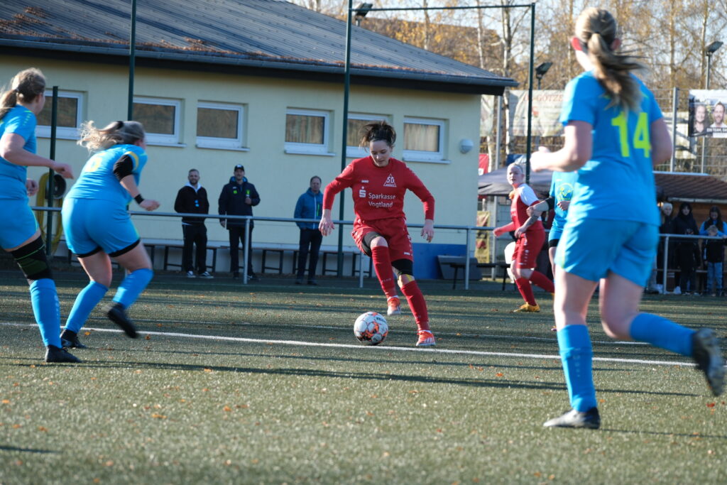Foto: C.Metzner Die Jößnitzerin Nina-Reneé Kirchner (rote Spielkleidung) sorgt mit ihrem Treffer für den verdienten Ausgleich. Sachsen Landesklasse Süd/West Frauen SG