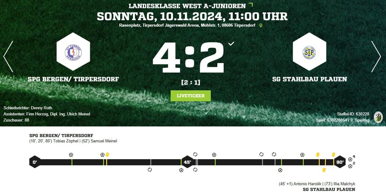 Am gestrigen Sonntag empfingen die A-Junioren zum Vogtland-Derby die Jungs vom SG Stahlbau Plauen. Wir führten 3:1 und hinten heraus wurde es nach dem 3:2 Anschlusstreffer noch einmal spannend. Tobi machte aber 10 Minuten vor Schluss mit seinem dritten Treffer den Deckel drauf und so konnten wir den 3. Platz in der Tabelle verteidigen.